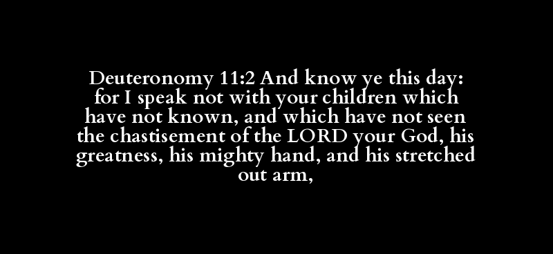 Deuteronomy 11:2 And know ye this day: for I speak not with your children which have not known, and which have not seen the chastisement of the LORD your God, his greatness, his mighty hand, and his stretched out arm,