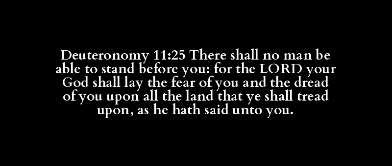 Deuteronomy 11:25 There shall no man be able to stand before you: for the LORD your God shall lay the fear of you and the dread of you upon all the land that ye shall tread upon, as he hath said unto you.