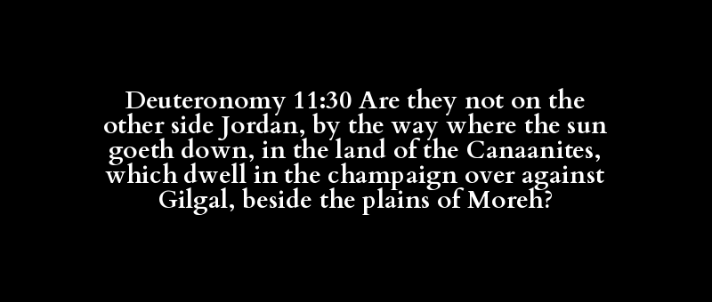Deuteronomy 11:30 Are they not on the other side Jordan, by the way where the sun goeth down, in the land of the Canaanites, which dwell in the champaign over against Gilgal, beside the plains of Moreh?