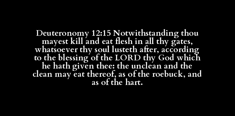 Deuteronomy 12:15 Notwithstanding thou mayest kill and eat flesh in all thy gates, whatsoever thy soul lusteth after, according to the blessing of the LORD thy God which he hath given thee: the unclean and the clean may eat thereof, as of the roebuck, and as of the hart.