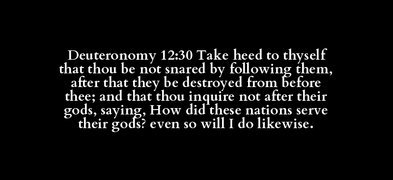 Deuteronomy 12:30 Take heed to thyself that thou be not snared by following them, after that they be destroyed from before thee; and that thou inquire not after their gods, saying, How did these nations serve their gods? even so will I do likewise.