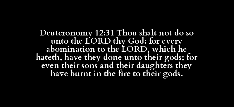 Deuteronomy 12:31 Thou shalt not do so unto the LORD thy God: for every abomination to the LORD, which he hateth, have they done unto their gods; for even their sons and their daughters they have burnt in the fire to their gods.