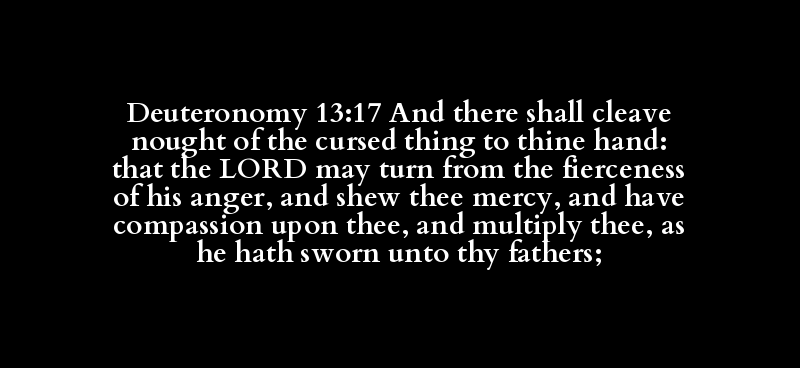 Deuteronomy 13:17 And there shall cleave nought of the cursed thing to thine hand: that the LORD may turn from the fierceness of his anger, and shew thee mercy, and have compassion upon thee, and multiply thee, as he hath sworn unto thy fathers;