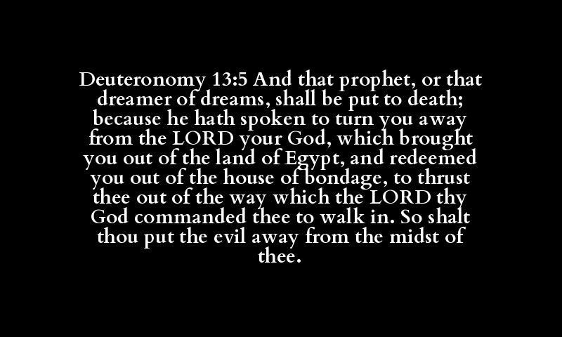 Deuteronomy 13:5 And that prophet, or that dreamer of dreams, shall be put to death; because he hath spoken to turn you away from the LORD your God, which brought you out of the land of Egypt, and redeemed you out of the house of bondage, to thrust thee out of the way which the LORD thy God commanded thee to walk in. So shalt thou put the evil away from the midst of thee.