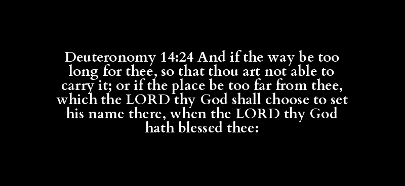 Deuteronomy 14:24 And if the way be too long for thee, so that thou art not able to carry it; or if the place be too far from thee, which the LORD thy God shall choose to set his name there, when the LORD thy God hath blessed thee: