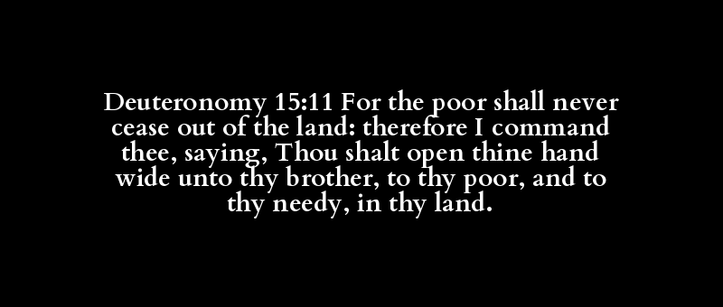 Deuteronomy 15:11 For the poor shall never cease out of the land: therefore I command thee, saying, Thou shalt open thine hand wide unto thy brother, to thy poor, and to thy needy, in thy land.