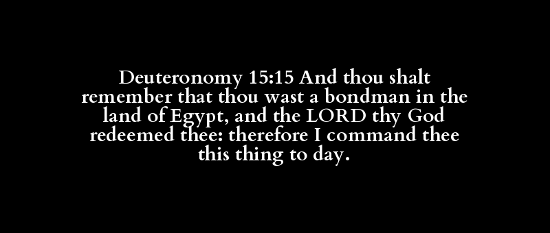 Deuteronomy 15:15 And thou shalt remember that thou wast a bondman in the land of Egypt, and the LORD thy God redeemed thee: therefore I command thee this thing to day.