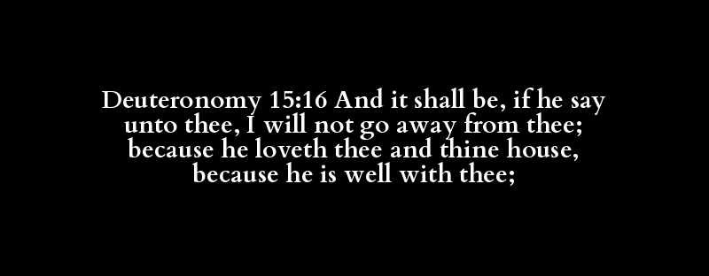 Deuteronomy 15:16 And it shall be, if he say unto thee, I will not go away from thee; because he loveth thee and thine house, because he is well with thee;