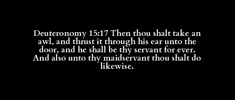 Deuteronomy 15:17 Then thou shalt take an awl, and thrust it through his ear unto the door, and he shall be thy servant for ever. And also unto thy maidservant thou shalt do likewise.