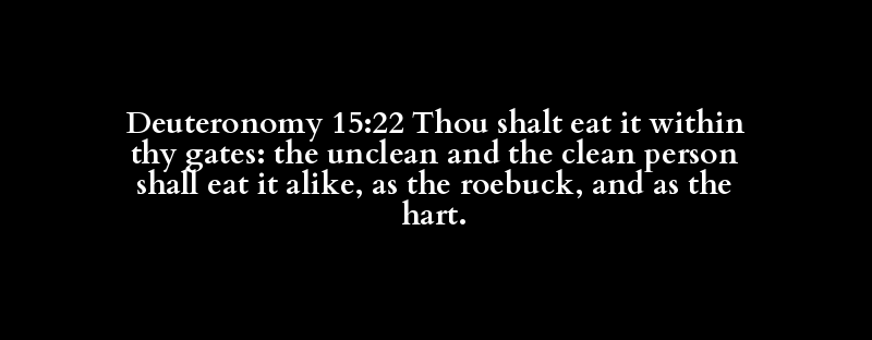 Deuteronomy 15:22 Thou shalt eat it within thy gates: the unclean and the clean person shall eat it alike, as the roebuck, and as the hart.