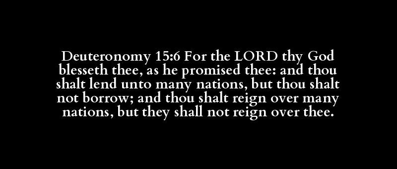 Deuteronomy 15:6 For the LORD thy God blesseth thee, as he promised thee: and thou shalt lend unto many nations, but thou shalt not borrow; and thou shalt reign over many nations, but they shall not reign over thee.