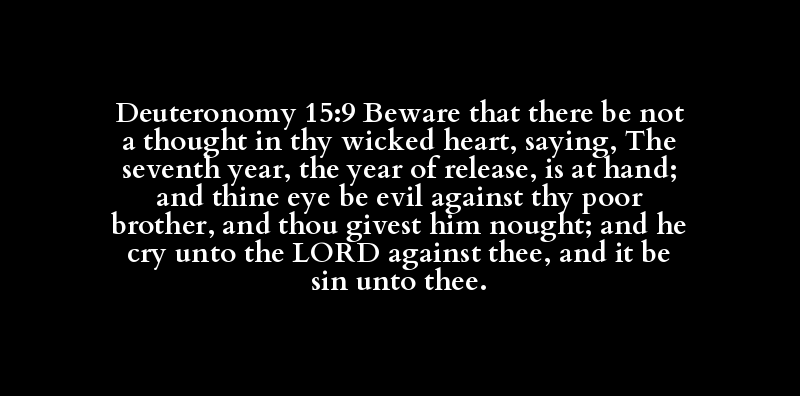 Deuteronomy 15:9 Beware that there be not a thought in thy wicked heart, saying, The seventh year, the year of release, is at hand; and thine eye be evil against thy poor brother, and thou givest him nought; and he cry unto the LORD against thee, and it be sin unto thee.
