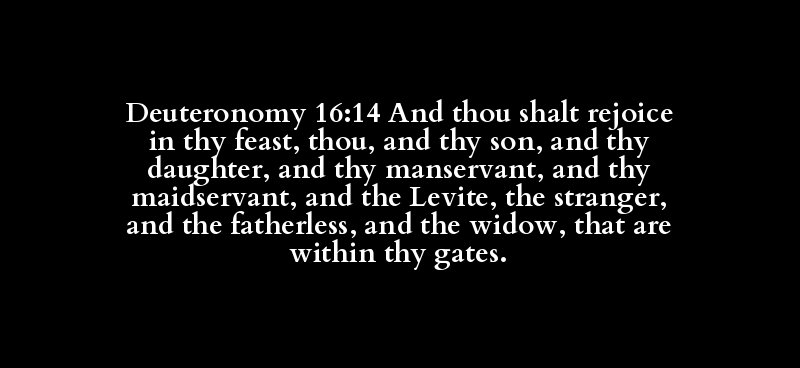 Deuteronomy 16:14 And thou shalt rejoice in thy feast, thou, and thy son, and thy daughter, and thy manservant, and thy maidservant, and the Levite, the stranger, and the fatherless, and the widow, that are within thy gates.