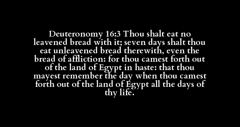Deuteronomy 16:3 Thou shalt eat no leavened bread with it; seven days shalt thou eat unleavened bread therewith, even the bread of affliction: for thou camest forth out of the land of Egypt in haste: that thou mayest remember the day when thou camest forth out of the land of Egypt all the days of thy life.