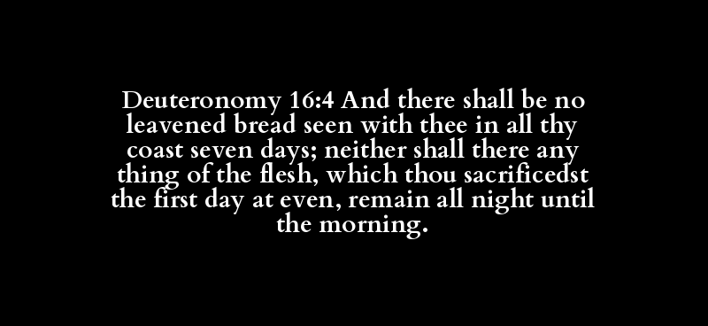 Deuteronomy 16:4 And there shall be no leavened bread seen with thee in all thy coast seven days; neither shall there any thing of the flesh, which thou sacrificedst the first day at even, remain all night until the morning.