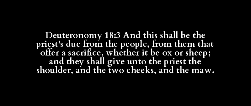 Deuteronomy 18:3 And this shall be the priest's due from the people, from them that offer a sacrifice, whether it be ox or sheep; and they shall give unto the priest the shoulder, and the two cheeks, and the maw.