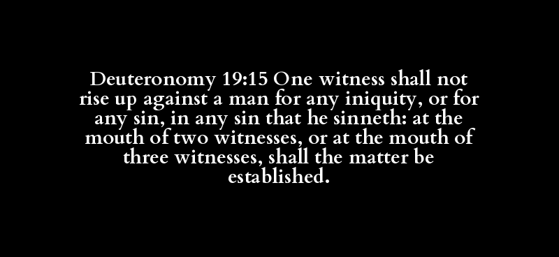 Deuteronomy 19:15 One witness shall not rise up against a man for any iniquity, or for any sin, in any sin that he sinneth: at the mouth of two witnesses, or at the mouth of three witnesses, shall the matter be established.