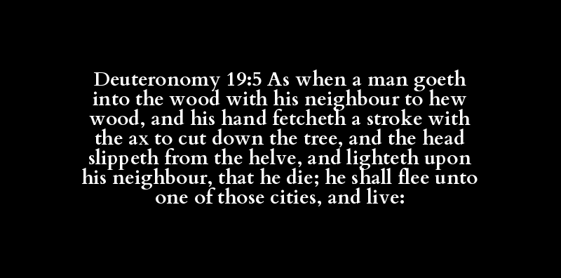 Deuteronomy 19:5 As when a man goeth into the wood with his neighbour to hew wood, and his hand fetcheth a stroke with the ax to cut down the tree, and the head slippeth from the helve, and lighteth upon his neighbour, that he die; he shall flee unto one of those cities, and live: