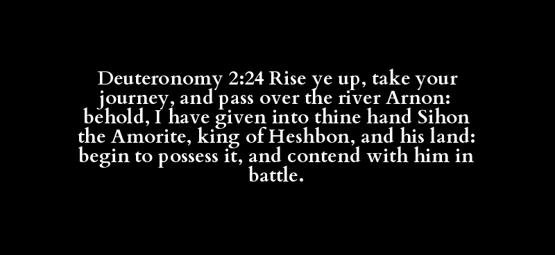 Deuteronomy 2:24 Rise ye up, take your journey, and pass over the river Arnon: behold, I have given into thine hand Sihon the Amorite, king of Heshbon, and his land: begin to possess it, and contend with him in battle.