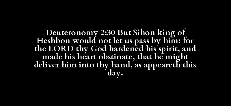 Deuteronomy 2:30 But Sihon king of Heshbon would not let us pass by him: for the LORD thy God hardened his spirit, and made his heart obstinate, that he might deliver him into thy hand, as appeareth this day.