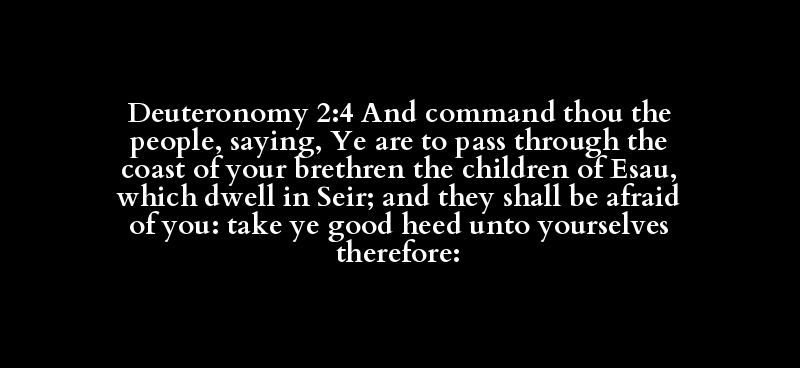 Deuteronomy 2:4 And command thou the people, saying, Ye are to pass through the coast of your brethren the children of Esau, which dwell in Seir; and they shall be afraid of you: take ye good heed unto yourselves therefore: