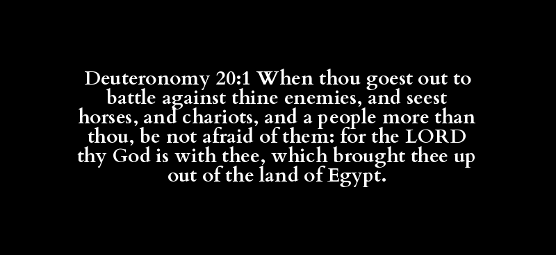 Deuteronomy 20:1 When thou goest out to battle against thine enemies, and seest horses, and chariots, and a people more than thou, be not afraid of them: for the LORD thy God is with thee, which brought thee up out of the land of Egypt.