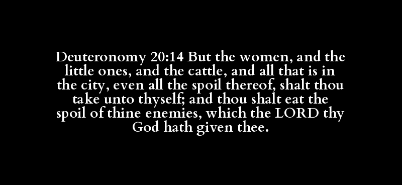Deuteronomy 20:14 But the women, and the little ones, and the cattle, and all that is in the city, even all the spoil thereof, shalt thou take unto thyself; and thou shalt eat the spoil of thine enemies, which the LORD thy God hath given thee.