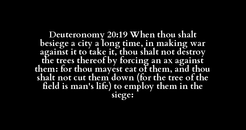 Deuteronomy 20:19 When thou shalt besiege a city a long time, in making war against it to take it, thou shalt not destroy the trees thereof by forcing an ax against them: for thou mayest eat of them, and thou shalt not cut them down (for the tree of the field is man's life) to employ them in the siege: