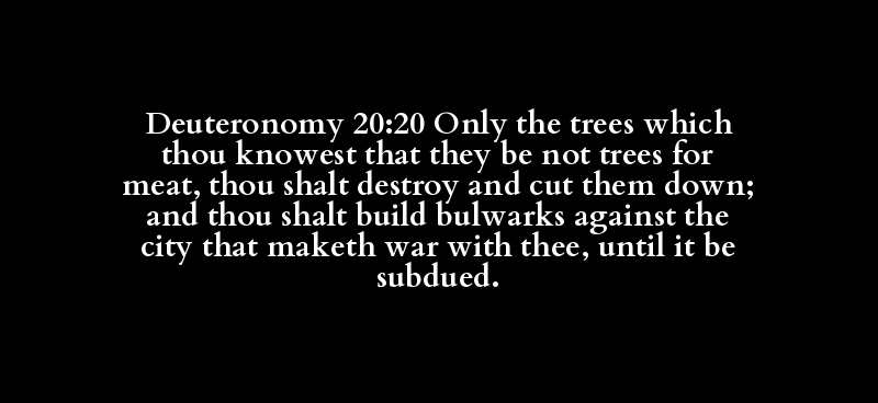 Deuteronomy 20:20 Only the trees which thou knowest that they be not trees for meat, thou shalt destroy and cut them down; and thou shalt build bulwarks against the city that maketh war with thee, until it be subdued.