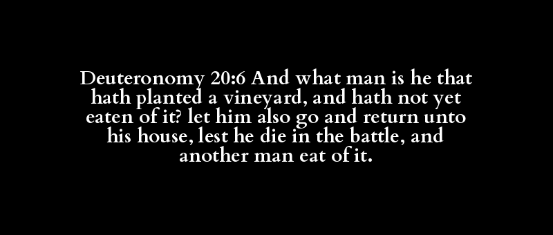 Deuteronomy 20:6 And what man is he that hath planted a vineyard, and hath not yet eaten of it? let him also go and return unto his house, lest he die in the battle, and another man eat of it.