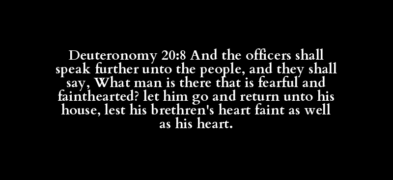 Deuteronomy 20:8 And the officers shall speak further unto the people, and they shall say, What man is there that is fearful and fainthearted? let him go and return unto his house, lest his brethren's heart faint as well as his heart.