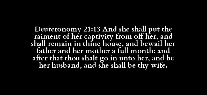 Deuteronomy 21:13 And she shall put the raiment of her captivity from off her, and shall remain in thine house, and bewail her father and her mother a full month: and after that thou shalt go in unto her, and be her husband, and she shall be thy wife.