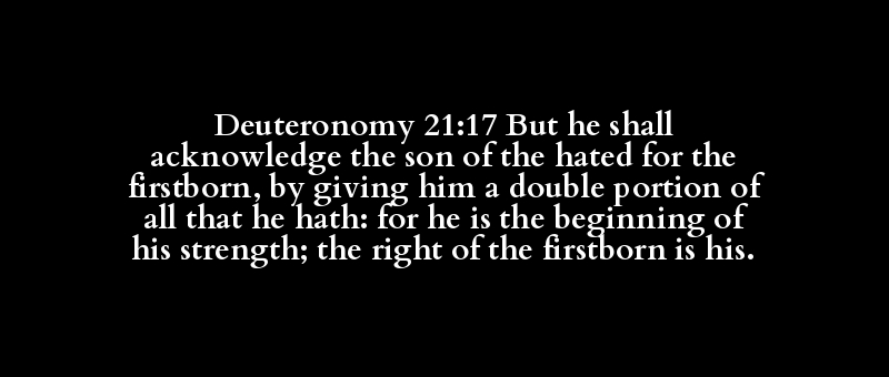 Deuteronomy 21:17 But he shall acknowledge the son of the hated for the firstborn, by giving him a double portion of all that he hath: for he is the beginning of his strength; the right of the firstborn is his.