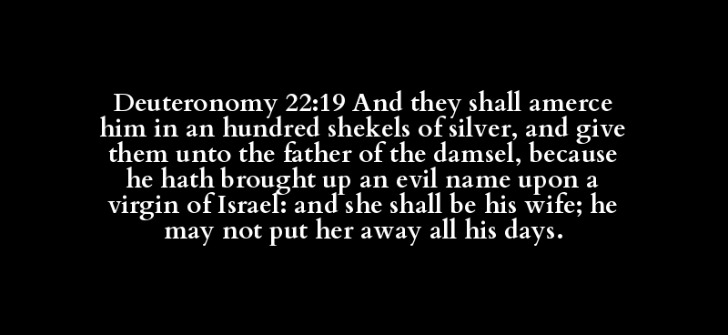 Deuteronomy 22:19 And they shall amerce him in an hundred shekels of silver, and give them unto the father of the damsel, because he hath brought up an evil name upon a virgin of Israel: and she shall be his wife; he may not put her away all his days.
