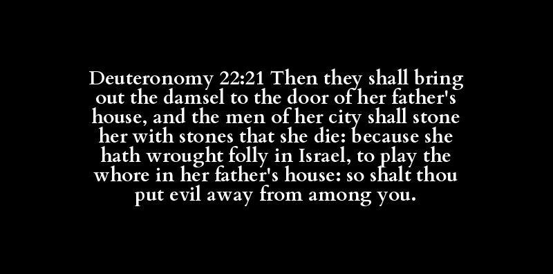 Deuteronomy 22:21 Then they shall bring out the damsel to the door of her father's house, and the men of her city shall stone her with stones that she die: because she hath wrought folly in Israel, to play the whore in her father's house: so shalt thou put evil away from among you.