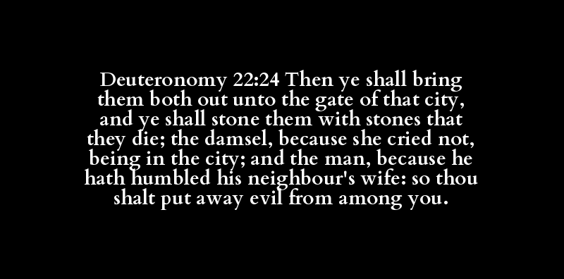 Deuteronomy 22:24 Then ye shall bring them both out unto the gate of that city, and ye shall stone them with stones that they die; the damsel, because she cried not, being in the city; and the man, because he hath humbled his neighbour's wife: so thou shalt put away evil from among you.