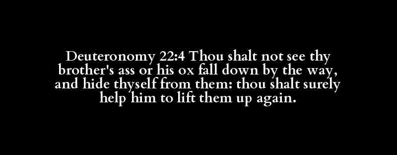 Deuteronomy 22:4 Thou shalt not see thy brother's ass or his ox fall down by the way, and hide thyself from them: thou shalt surely help him to lift them up again.