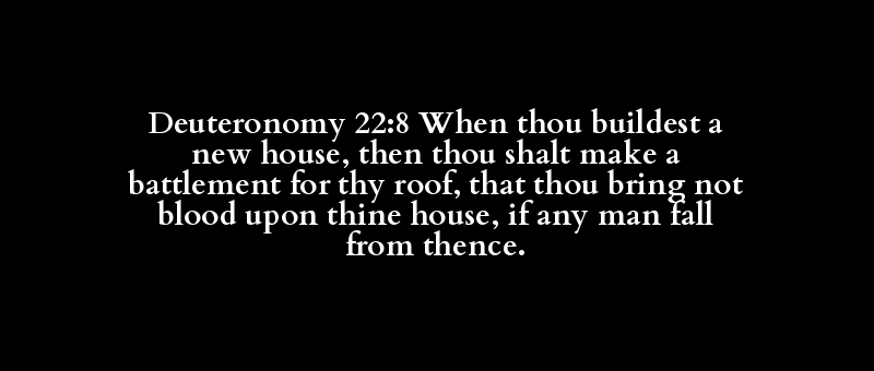 Deuteronomy 22:8 When thou buildest a new house, then thou shalt make a battlement for thy roof, that thou bring not blood upon thine house, if any man fall from thence.