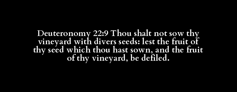 Deuteronomy 22:9 Thou shalt not sow thy vineyard with divers seeds: lest the fruit of thy seed which thou hast sown, and the fruit of thy vineyard, be defiled.