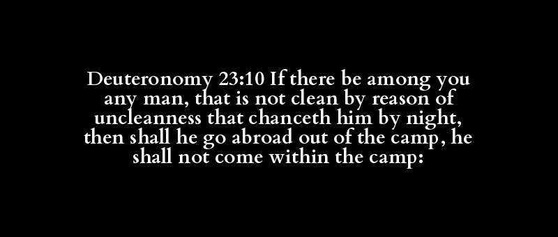 Deuteronomy 23:10 If there be among you any man, that is not clean by reason of uncleanness that chanceth him by night, then shall he go abroad out of the camp, he shall not come within the camp: