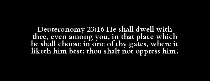Deuteronomy 23:16 He shall dwell with thee, even among you, in that place which he shall choose in one of thy gates, where it liketh him best: thou shalt not oppress him.