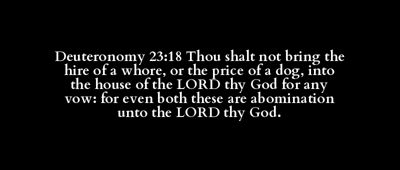 Deuteronomy 23:18 Thou shalt not bring the hire of a whore, or the price of a dog, into the house of the LORD thy God for any vow: for even both these are abomination unto the LORD thy God.