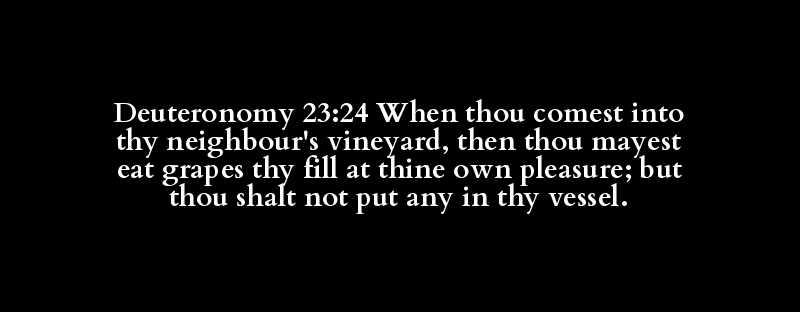 Deuteronomy 23:24 When thou comest into thy neighbour's vineyard, then thou mayest eat grapes thy fill at thine own pleasure; but thou shalt not put any in thy vessel.