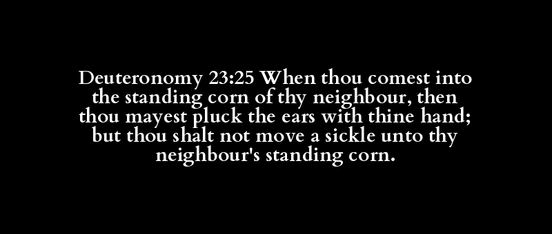 Deuteronomy 23:25 When thou comest into the standing corn of thy neighbour, then thou mayest pluck the ears with thine hand; but thou shalt not move a sickle unto thy neighbour's standing corn.