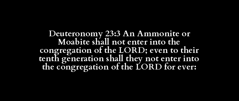 Deuteronomy 23:3 An Ammonite or Moabite shall not enter into the congregation of the LORD; even to their tenth generation shall they not enter into the congregation of the LORD for ever: