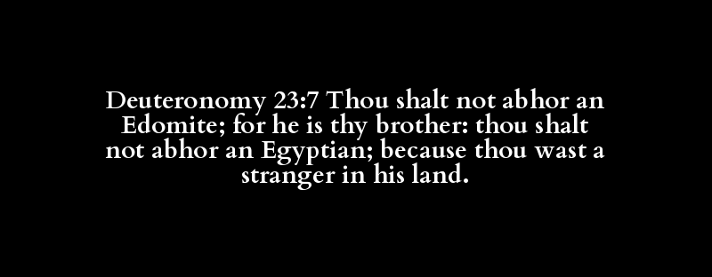 Deuteronomy 23:7 Thou shalt not abhor an Edomite; for he is thy brother: thou shalt not abhor an Egyptian; because thou wast a stranger in his land.