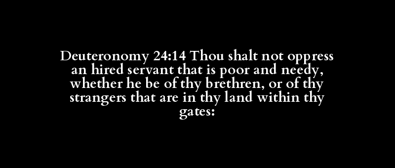 Deuteronomy 24:14 Thou shalt not oppress an hired servant that is poor and needy, whether he be of thy brethren, or of thy strangers that are in thy land within thy gates: