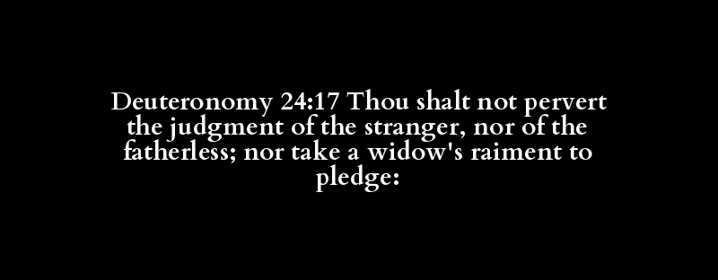 Deuteronomy 24:17 Thou shalt not pervert the judgment of the stranger, nor of the fatherless; nor take a widow's raiment to pledge:
