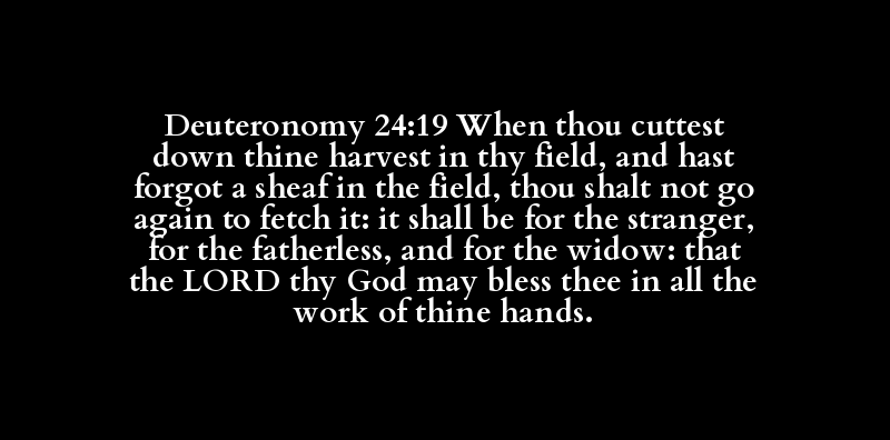 Deuteronomy 24:19 When thou cuttest down thine harvest in thy field, and hast forgot a sheaf in the field, thou shalt not go again to fetch it: it shall be for the stranger, for the fatherless, and for the widow: that the LORD thy God may bless thee in all the work of thine hands.