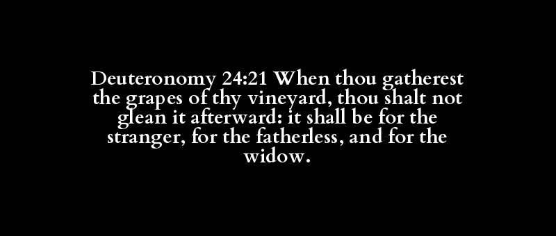 Deuteronomy 24:21 When thou gatherest the grapes of thy vineyard, thou shalt not glean it afterward: it shall be for the stranger, for the fatherless, and for the widow.